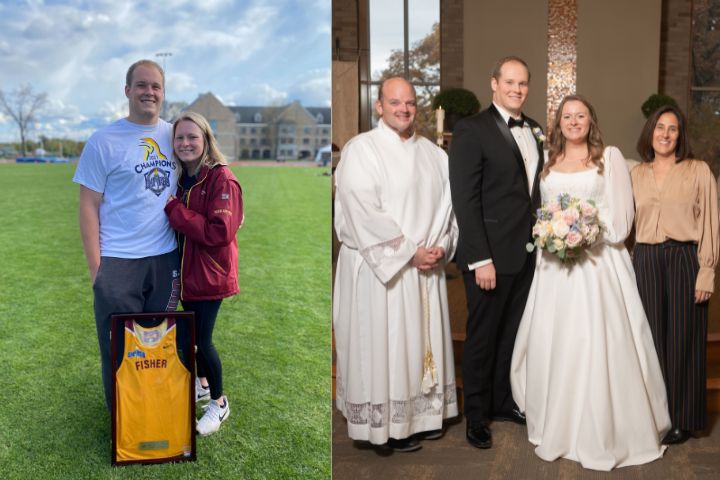Gabby Dunkelberg ’20 and James Felice ’18 met on the SJF cross country and track and field teams in 2016. Their shared passion for running brought them closer, and they started dating in 2018. Together, they bought a house, adopted a dog, and are now planning their wedding for June 2026 at Fisher in the Hermance Family Chapel of St. Basil the Great!